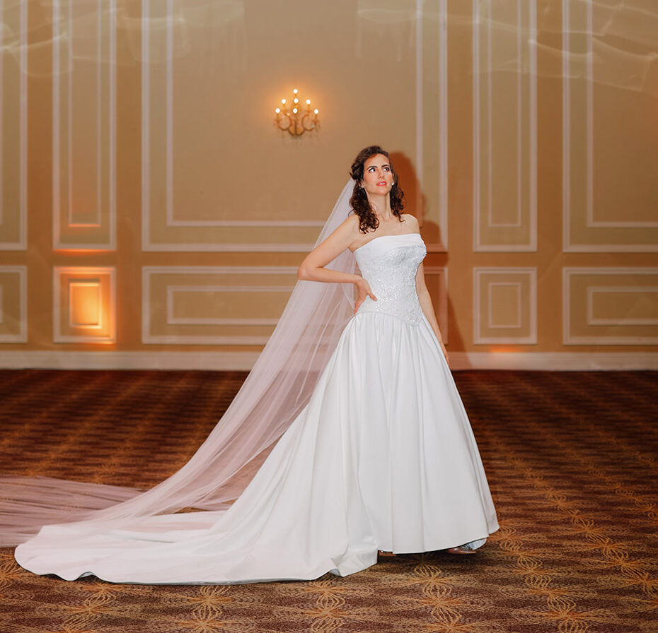 The Aurelia Gown is defined by its intricately hand-beaded floral corset paired with a structured satin skirt that creates a refined, architectural silhouette. Designed for brides who seek timeless sophistication with modern strength, this gown balances delicate detailing with confident structure.
